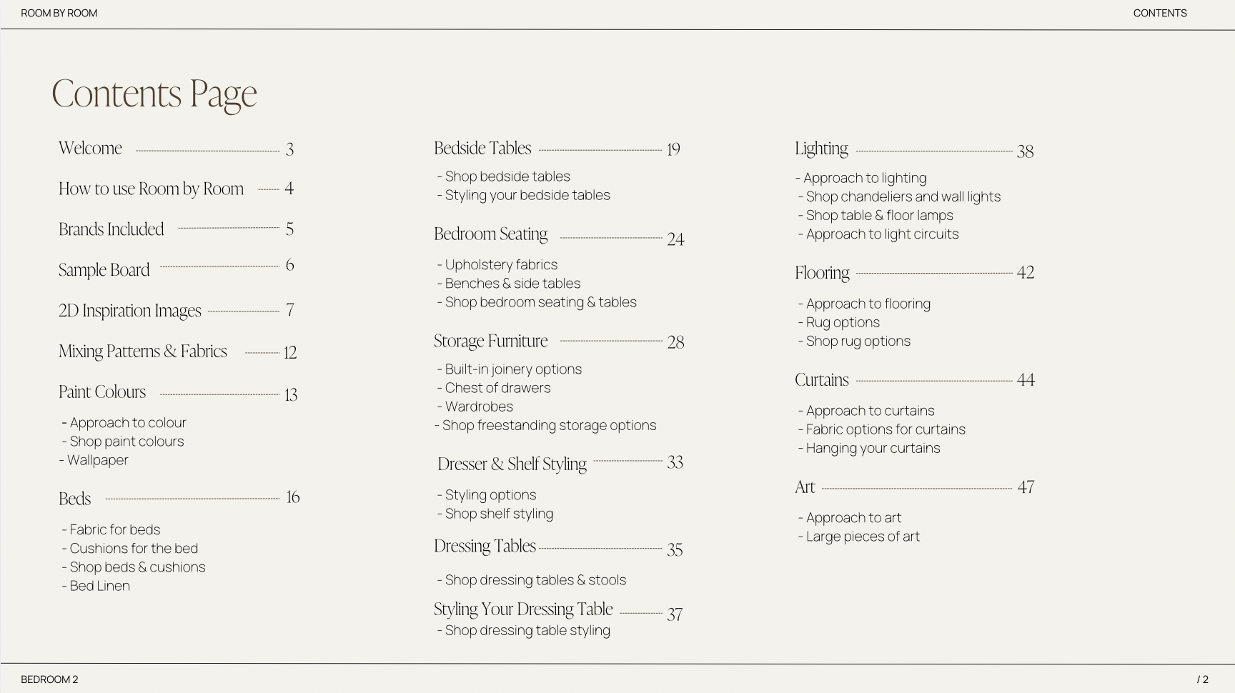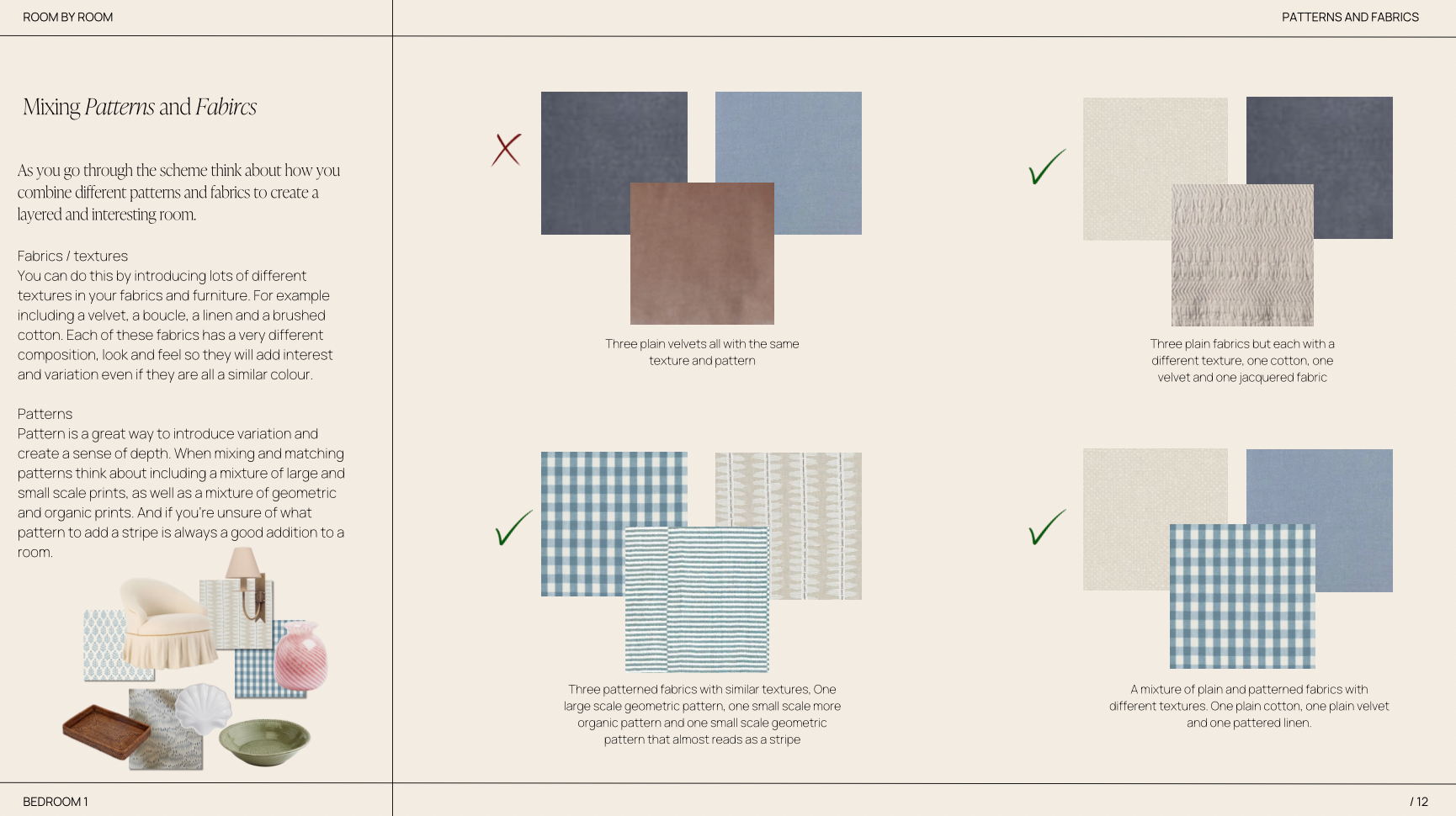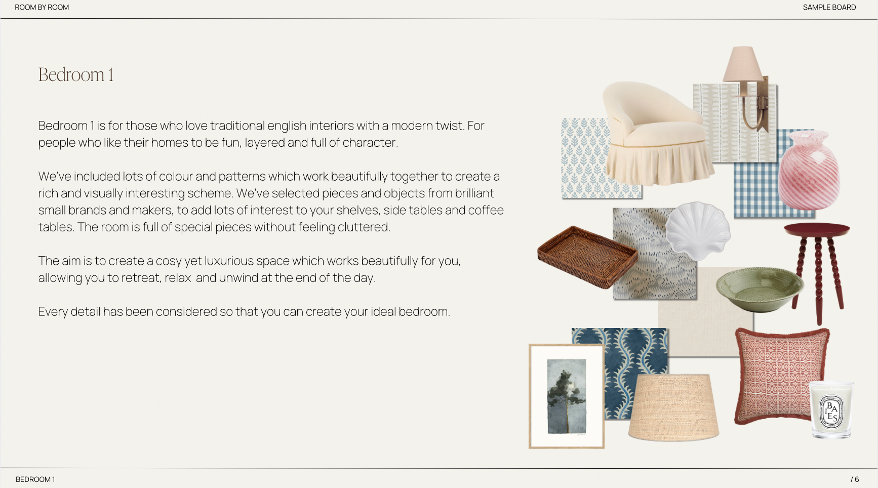 This room is for those who love traditional english interiors with a modern twist. For people who like their homes to be fun, layered and full of character. The colour palette is warm, playful and varied with blues and pops or pinks, reds and greens. This is not about being paired back. There are lots of patterns and prints in this scheme, that work beautifully together to create that lovely layered and rich look. We've selected beautiful pieces from amazing brands and makers to style your bed, bedside tables, dressing tables and shelves. Each piece adds character and feel like they're things you've accumulated over time. The aim is to create a really cosy, warm and interesting space, that you will love to retreat to and unwind at the end of the day. Every detail has been considered.