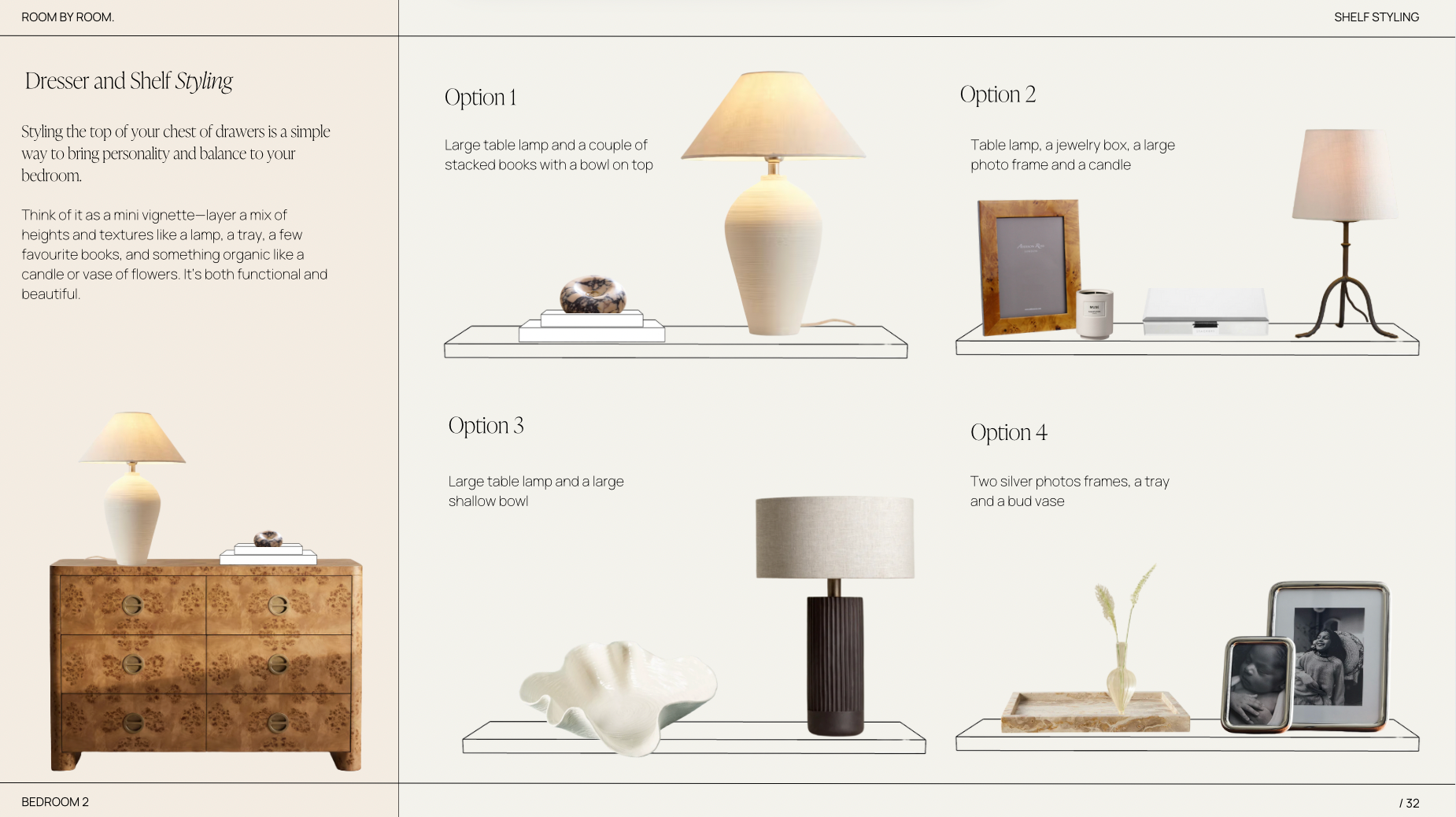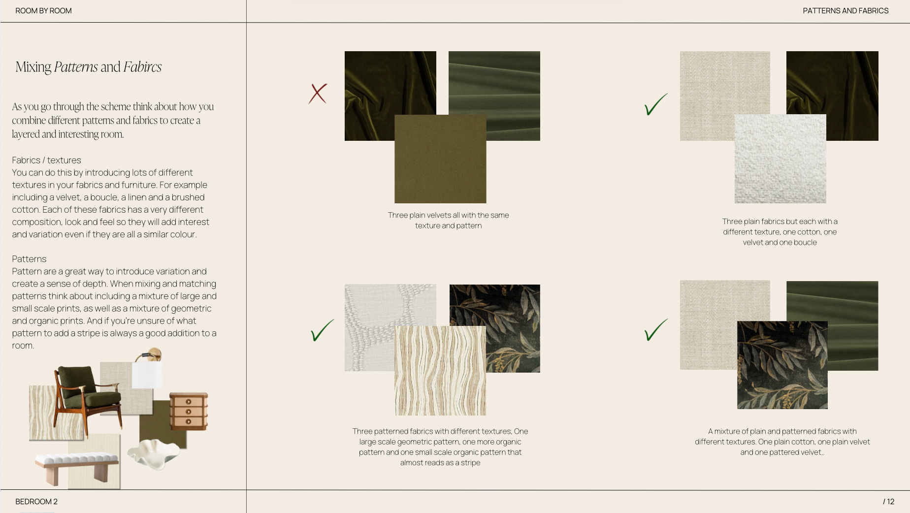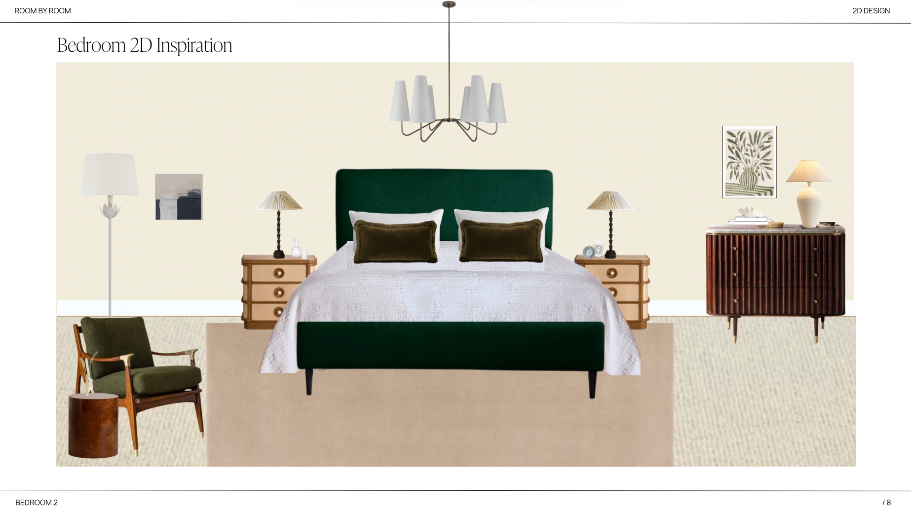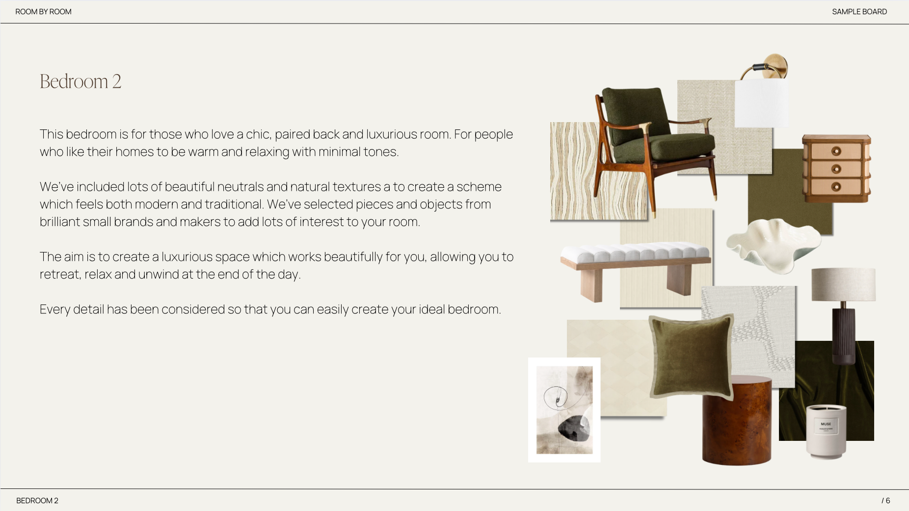 This room is for those who love their interiors to be chic, paired back and luxurious. For people who like their homes to feel warm and inviting but with a sophisticated minimal feel to them. It's quite a modern scheme but with a nod to traditional interiors. The colour palette is minimal and muted with pops of deep greens and rich wood tones. Think warm off whites, slubby linens and luxurious velvets. There are subtle patterns in some of the fabrics but the main focus is on lots of varied texture with beautiful pieces that not only look great but feel wonderful to the touch. We've selected beautiful accessories from wonderful brands and makers to style your bed, bedside tables, dressing tables and shelves. Each piece works perfectly together to add interest and character to the room. The aim is to create a tranquil space to retreat to and unwind at the end of the day. Every detail has been considered.